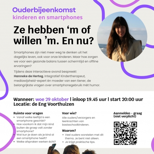 Ouderbijeenkomst - Smartphonevrij OpgroeienNet als in veel landen om ons heen krijgen kinderen in Nederland gemiddeld steeds jonger hun eerste smartphone. Groepsdruk speelt hierbij vaak een rol: als veel kinderen in de klas er eentje hebben, wil je niet buiten de boot vallen. Ook bereikbaarheid is vaak een reden. Het ouderinitiatief Smartphonevrij Opgroeien probeert de groepsdruk weg te nemen. Op meer dan tweederde van alle basisscholen in Nederland spreken ouders van al meer dan 40.000 kinderen samen af om het geven van een smartphone nog een paar jaar uit te stellen. Voor de bereikbaarheid biedt een simpele, internetloze telefoon een oplossing. Heb je twijfels over het geven van een smartphone aan je kind?Je bent niet alleen: schermstrijd is in veel gezinnen een realiteit. Uit onderzoek blijkt dat het jonge kinderbrein nog niet is opgewassen tegen de impulsen van een smartphone. Een eigen toestel met internet in de broekzak maakt het navigeren door de wereld van apps en sociale media een grote opvoeduitdaging. Als ouders maken we dit onderwerp graag bespreekbaar voor iedereen die daar behoefte aan heeft.